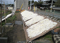 ゆで干し大根は、特に霜の降りる寒い頃がおいしくできます。つくるのに一週間ほどかかり、一度蒸すことで、甘味が出ておいしくなります。20kgの大根から1kgのゆで干し大根ができます。 たいへん手間のかかるお仕事なのでつくる人が年々少なくなってきています。